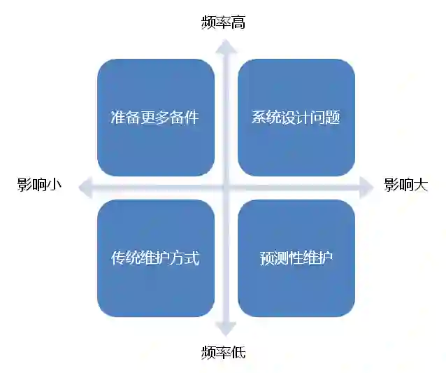 在这里借鉴美国智能维护系统(IMS)中心的分类,参考下图,纵轴代表故障发生频率,横轴表示故障发生后的影响。预测性维护适用于发生频率不高,但一旦发生影响很大的故障。
