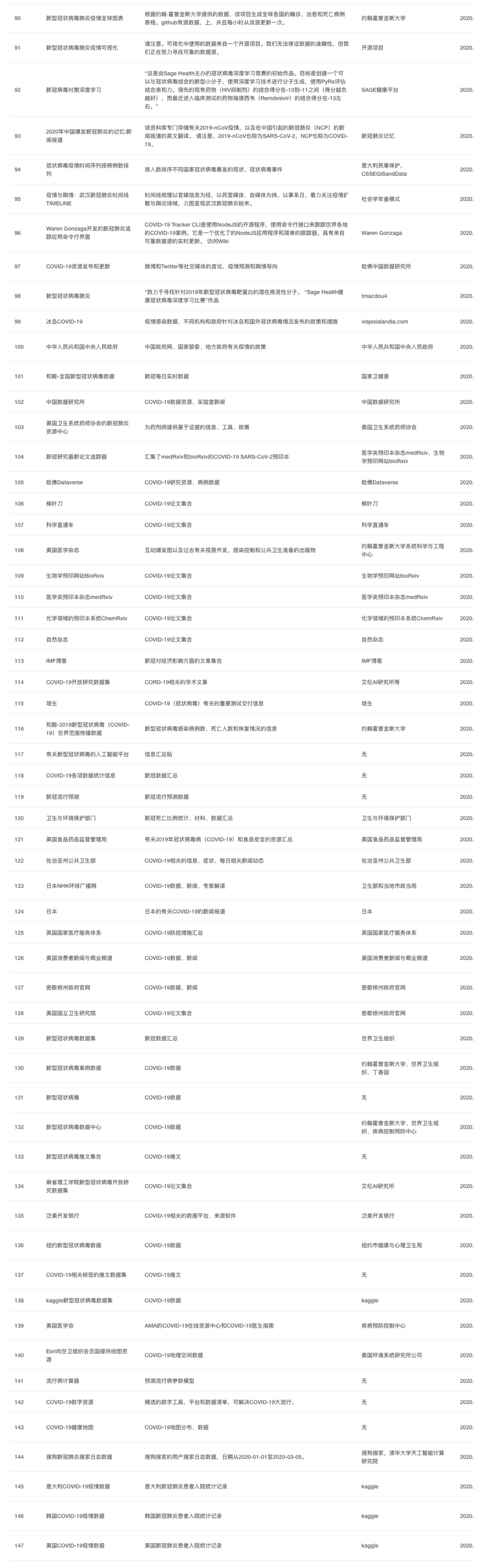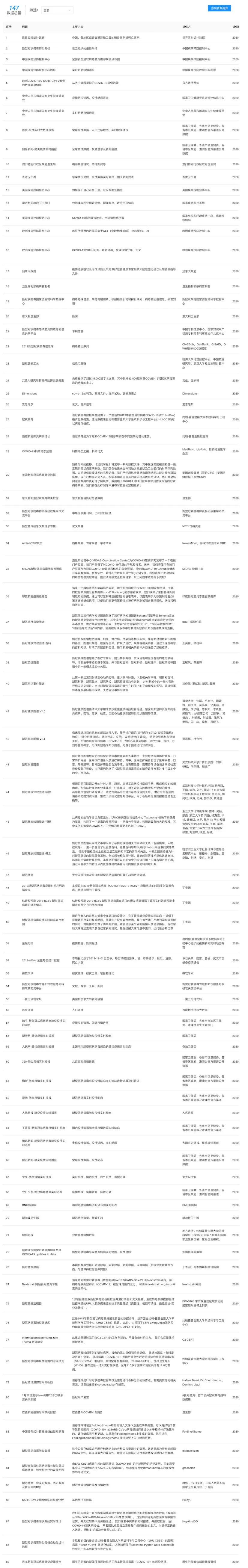 新冠肺炎(COVID-19)开放数据源,旨在汇集世界上最全面的新冠肺炎开放数据源。自疫情发端即致力于收集来自世界各地各种类型的相关开放数据,并保持持续更新。
