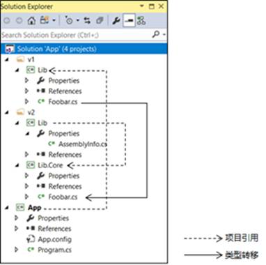 上图中的虚线箭头和实线箭头分别代表项目之间的引用关系,我们从中可以看出v2目录下的Lib项目具有对Lib.Core项目的引用,因为它需要引用转移到Lib.Core项目中的类型。为了完成针对类型Foobar的转移,我们只需要在v2\Lib中定义如下一行简单的代码就可以了,我们将这行代码定义在AssemblyInfo.cs文件中。