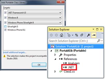 在.NET Framework的时代,创建可移植类库(PCL:Portable Class Library)是实现跨多个目标框架程序集共享的唯一途径。上面介绍的内容都是在为PCL做铺垫,只有充分理解了Retargetable程序集和类型转移的前提下才可能了解PCL的实现原理有正确的理解。考虑到很多读者朋友并没有使用PCL的经历,所以我们先来介绍一下如何创建一个PCL项目。 当我们采用Visualization Studio的Class Library(Portal)项目模板创建一个PCL项目的时候,需要在如下图所示的对话框中选择支持的目标框架及其版本。Visual Studio会为新建的项目添加一个名为 “.NET” 的引用,这个引用指向一个由选定目标框架决定的程序集列表。由于这些程序集提供的API能够兼容所有选择的平台,我们在此基础编写的程序自然也具有平台兼容性。