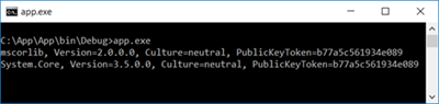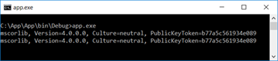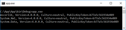 在无需重新编译(确保运行的依然是同一个程序集)直接运行App.exe,我们会在控制台上得到如下图所示的输出结果,可以看到三个程序集的版本全部变成了4.0.0.0,也就说真正被CLR加载的这些基础程序集是与当前CLR的版本相匹配的。
