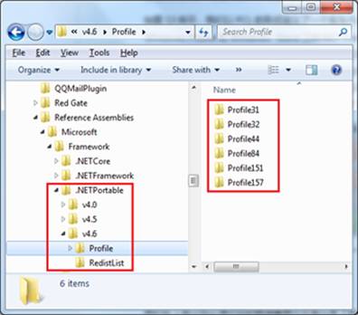 如上图所示,本机所在目录“%ProgramFiles%\Reference Assemblies\Microsoft\Framework\.NETPortable”下具有三个代表.NET Framework版本的子目录(v4.0、v4.5和v4.6)。具体到针对某个.NET Framework版本的目录(比如v4.6),其子目录Profile下具有一系列以 “Profile” + “数字” (比如Profile31、Profile32和Profile44等)命名的子目录,实际上PCL项目引用的就是存储在这些目录下的程序集。