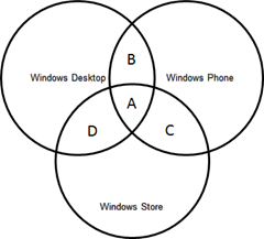 对于两个不同平台的.NET Framework来说,它们的BCL在API的定义上存在交集,从理论上来说,建立在这个交集基础上的程序是可以被这两个平台中共享的。如下图所示,如果我们编写的代码需要分别对Windows Desktop/Phone、Windows Phone/Store和Windows Store/Desktop平台提供支持,那么这样的代码依赖的部分仅限于两两的交集A+B、A+C和A+D。如果要求这部分代码能够运行在Windows Desktop/Phone/Store三个平台上,那么它们只能建立在三者之间的交集A上。