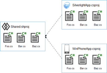 如上图所示,我们可以创建一个Shared Project类型的项目Shared.shproj,并将需要共享的三个C#文件(Foo.cs、Bar.cs和Baz.cs)添加进来。我们将针对这个项目的引用同时添加到一个Silverlight项目(SilverlightApp.csproj)和Windows Phone项目(WinPhoneApp.csproj)之中,当我们对这两个项目实施编译的时候,包含在项目Shared.shproj中的三个C#文件会自动作为当前项目的源文件参与编译。
