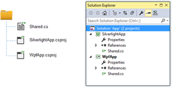 如下图所示,两个分别针对Silverlight和WPF的项目共享相同的目录,与两个项目文件同在一个目录下的C#文件Shared.cs可以同时被包含到这两个项目之中。