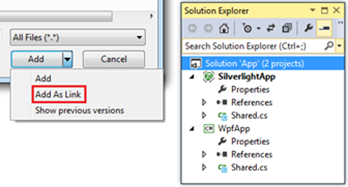 同样还是上面演示分别针对Silverlight和WPF的两个项目,不论项目文件和需要被共享的文件存在于哪个目录下面,我们都可以采用如下图所示的添加文件链接的方式分享这个Shared.cs文件。‘