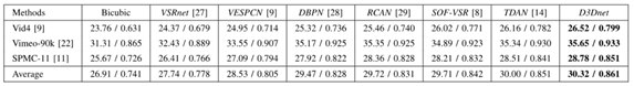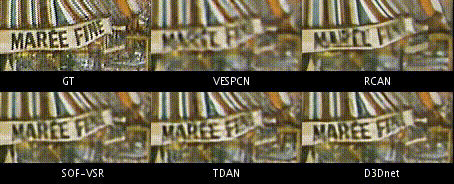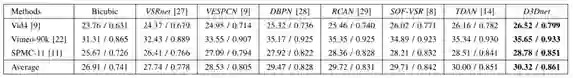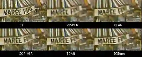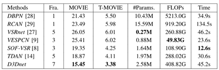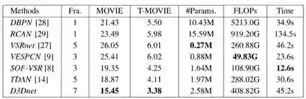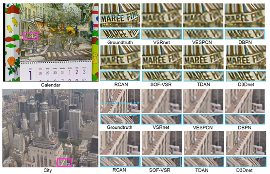 该文在表2所示的3个公开数据集上将D3Dnet与单帧超分辨算法DBPN(CVPR18)、RCAN(ECCV18)以及视频超分辨算法VSRnet(TCI16),VESPCN(CVPR17),SOF-VSR(TIP20),以及TDAN(CVPR20)进行了比较。此外,该文还采用了双三次插值的结果作为基准对照组。算法对比的结果如下。