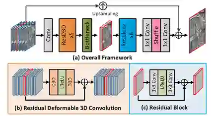 该文提出基于可变形三维卷积的视频超分辨网络(D3Dnet),通过将可变形卷积与三维卷积相结合,设计了可变形三维卷积(D3D)以同时进行时空信息提取与帧间运动补偿。D3Dnet结构简单、设计精巧,相比于领域内其他先进算法,在不大幅度增加计算开销的前提下,显著提升了视频超分辨的性能。得益于较好的时空建模与帧间运动补偿能力,D3Dnet输出的视频具有更高的流畅度。