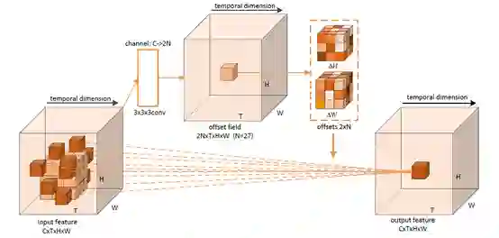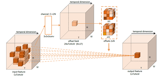 如图1所示,D3D将可变形二维卷积(Deformable Convolution, DCN)与三维卷积(3D Convolution, C3D)进行结合,输入特征中的浅橙色立方体代表3×3×3的C3D卷积核,深橙色立方体代表3×3×3的D3D卷积核。其中,D3D卷积核的偏移量(offset)由偏移量生成器(3×3×3的C3D卷积)产生。如图1上方部分所示,位于偏移空间(offset field)的特征的通道维度为2N(此处N为27),代表对应3×3×3卷积核在高度H和宽度W上的偏移量。