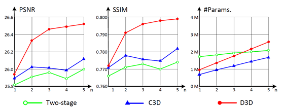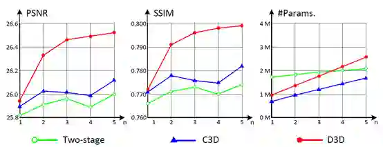 图3实验表明,相较于two-stage 算法,one-stage算法能够更加充分地利用视频中的时空信息,以较少的参数获得更好的性能;相较于C3D,D3D能够灵活地提取时空信息,有效对帧间运动进行补偿,获得质量更高的超分辨视频序列。