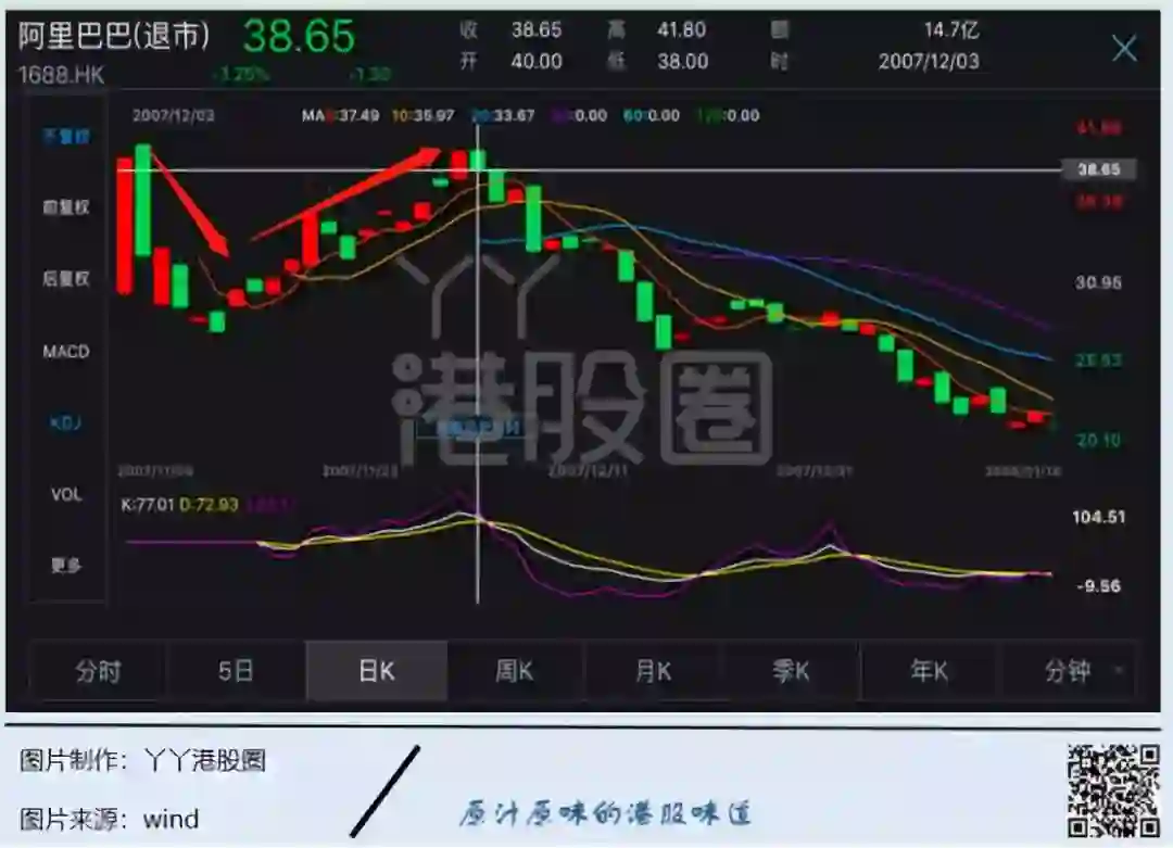 12月3号,阿里股价再次突破40港元,触及41.8港元的高位,这是阿里巴巴的高光时刻,也是阿里巴巴和香港股民最为你侬我侬的蜜月期。
