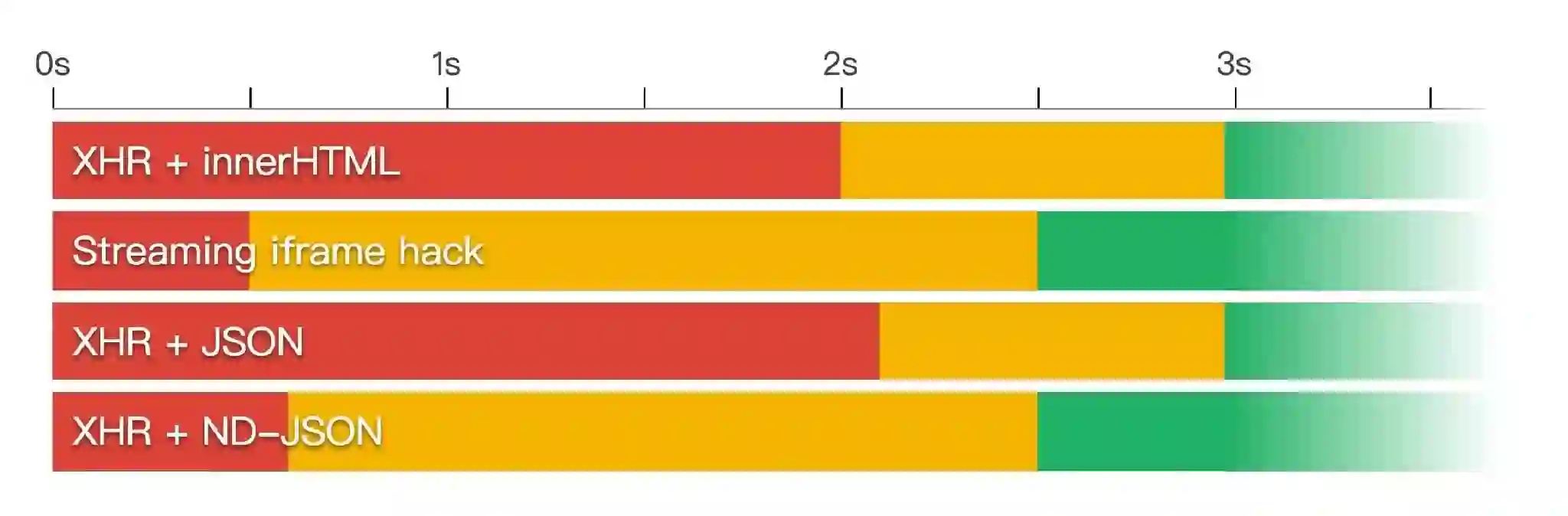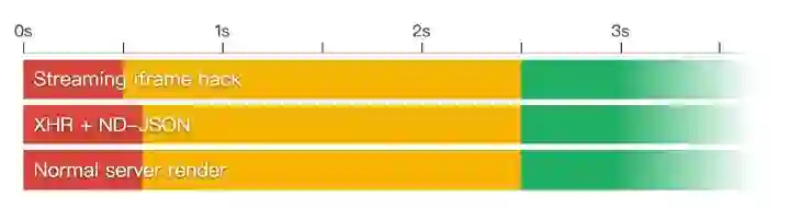 与常规 JSON 相比,ND-JSON 提前 1.5s 将内容渲染到页面上,尽管速度不如 iframe 方法那么快。在创建元素之前,必须等待完整的 JSON 对象出现。如果你的 JSON 文件体量巨大,可能会陷入对流的企盼之中。