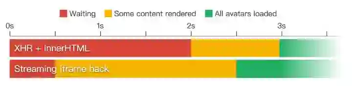 使用 iframe 进行流式渲染,页面加载速度提高了 1.5 s。头像也提前半秒钟加载完成 —— 流式渲染意味着浏览器可以更早发现它们,并与内容一起并行下载。