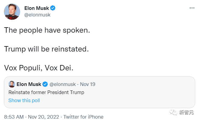 「人民已经表态。特朗普将被解封。Vox Populi, Vox Dei。」马斯克随后发推说。