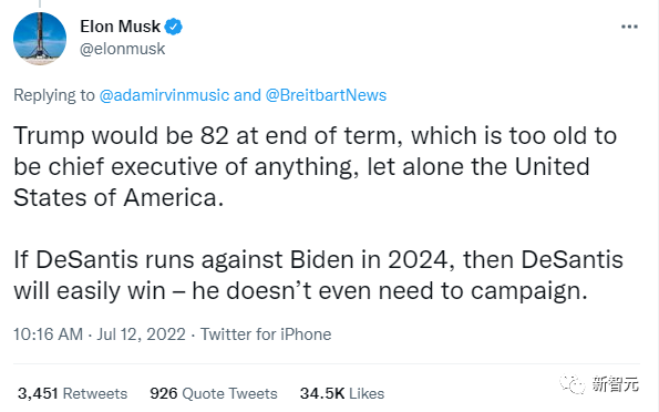 今年7月12日,马斯克曾发推表示:「特朗普等到下届任期结束都82岁了,这对于任何公司的CEO都太老了,更别当美国总统了。」