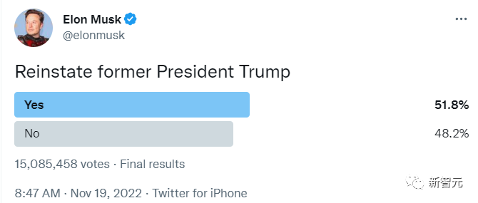 马斯克在傍晚时分宣布了这一消息,此前,他举行了一次twitter用户的全民投票,要求用户就是否应该解封特朗普的账号点击 "是 "或 "否",为期24小时。