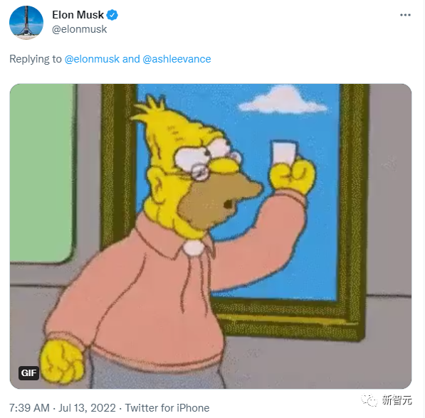 随后,马斯克也是立马给出了回应,他在推特上放出了《辛普森一家》里的一张图,暗讽川普是个「老喷子」。