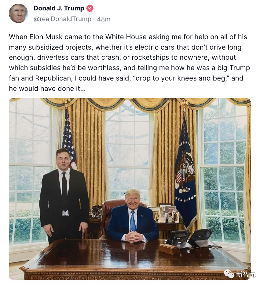 言语嘲讽还不够,还附上一张图,自己坐在椭圆办公室的正座上,马斯克在一边「站着如喽啰」。