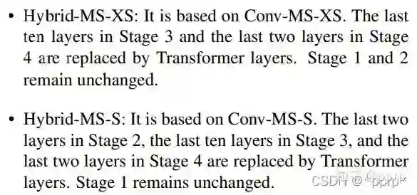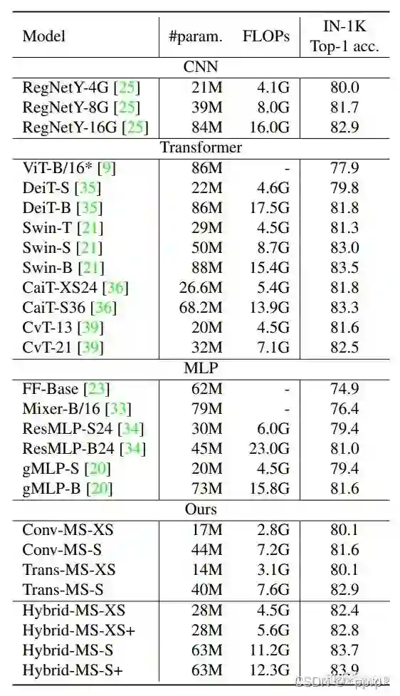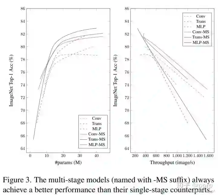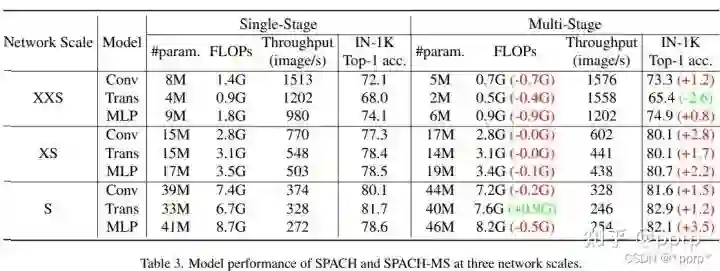 可以发现,有一个例外,在xxs尺度下,Transformer进度损失了2.6个百分点,因为多阶段模型恰好只有单阶段模型一半的参数量和Flops。