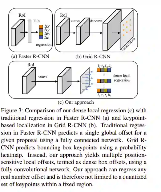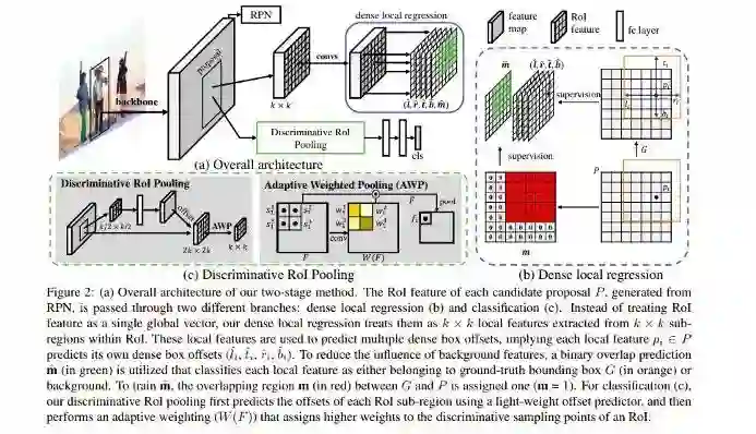 这篇论文提出了一种提高定位精度和分类准确率的方法 D2Det,以提升目标检测的效果。针对这两项挑战,该研究分别提出了 dense local regression(DLR)和 discriminative RoI pooling(DRP)两个模块。其中 DLR 与 anchor-free 方法 FCOS 的 detect loss 类似,DRP 则是利用了 deformable convolution 的思想,分别从第一阶段和第二阶段提取准确的目标特征区域,进而获得相应的性能提升。具体方法流程如下图所示: