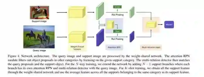 该研究提出一个新型注意力网络,能在 RPN 模块和检测器上学习 support set 和 query set 之间的匹配关系;下图中的 weight shared network 有多个分支,可以分为两类,一类用于 query set,另一类用于 support set(support set 的分支可以有多个,用来输入不同的 support 图像,图中只画了一个),处理 query set 的分支是 Faster RCNN 网络。