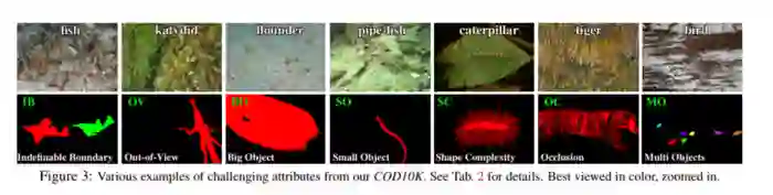 下图展示了 COD10K 数据集中的样本示例及其难点。