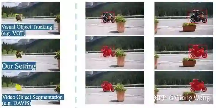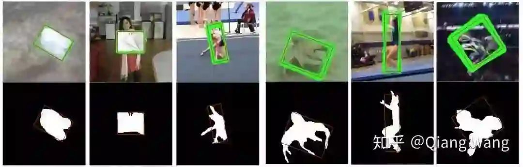 为了方便表述,早期的跟踪算法都是坐标轴对齐的的矩形框。但随着跟踪精度的不断提升,数据集的难度在不断提升,在 VOT2015 时即提出使用旋转矩形框来作为标记。在 VOT2016 的时候提出自动的通过 mask 来生成旋转框的方法。更为本质的,我们会发现,这个旋转的矩形框实际上就是 mask 的一种近似。我们所要预测的实际上就是目标物体的 mask。利用 mask 才能得到精度本身的上界。