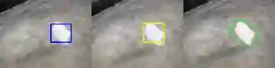 而在物体发生旋转的时候,简单的 box 的表述通常会产生极大的损失,这实际上就是表述本身存在的缺陷。而为了进一步探索在精度上存在的问题。我们更进一步,直接预测物体的 mask。这种表述使得我们可以得到最为准确的 box。最直观的利用一个简单的事例的可视化就可以看出,这三种算法的区别(左中右分别是 SiamFC | SiamRPN | SiamMask)。