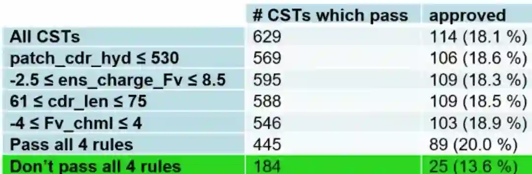 四项规则根据 Fv 疏水性、电荷、CDR 长度和电荷差值来描述抗体,并有理由对候选者进行粗过滤,因为它们可用于减少聚集、粘度和清除,以及它们适度富集的能力,对于 FDA 批准的抗体。