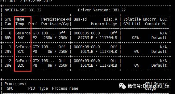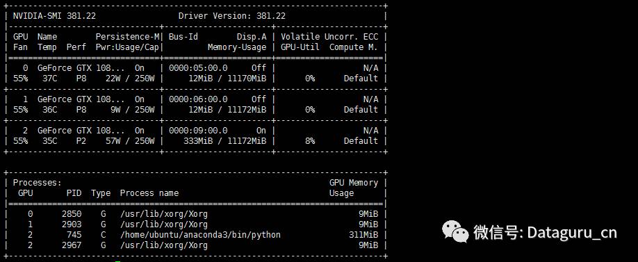 这里用的是2卡进行计算测试,我们可以看到,2卡的Perf(性能)一项已经被调整为“P2”(其它卡仍为P8),2卡的温度为35度,而且三个风扇的速度均为55%。“P2”指的是nvidia的显卡power state,从P0到P12,最高性能状态为P0,运行计算是为P2,最低功耗(最低性能)为P12。