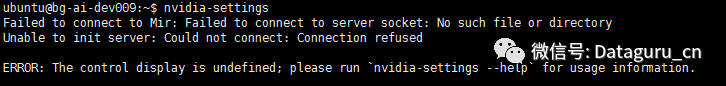 一般在ubuntu上搭建完深度学习环境后,许多朋友习惯把ubuntu的X桌面服务禁用掉,然后通过另一台windows系统的电脑通过ssh来连接GPU机器使用。这个时候X server已经被禁用掉,开机也自动启动命令行模式,上面第一种做法就不适用于这种情况了。原因是,nvidia-settings只能在X桌面环境下运行,若你想强行使用这个设置就会报错: