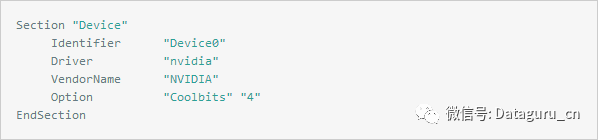 2. 在Section "Device"里面加入 Option "Coolbits" "4"