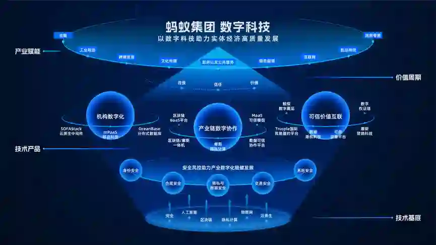 这一部分依托于从支付宝、蚂蚁集团孵化成长出来的数据库、云科技业务、安全产品和服务,包括OceanBase、SOFAStack、mPaaS、Zoloz等底层科技产品,主要致力于企业和机构本身的数字化,解决产业数字化第一步的“有没有完成数字化”问题。其中,安全科技是企业发展的基石,作为贯穿整个数字化转型生命周期的核心命题,蚂蚁也在安全科技方面进行了全方位的布局。