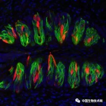 舌头背面的味觉细胞。红色的细胞能够感知酸味,绿色细胞能够检测苦味、甜味、鲜味。细胞核呈蓝色。