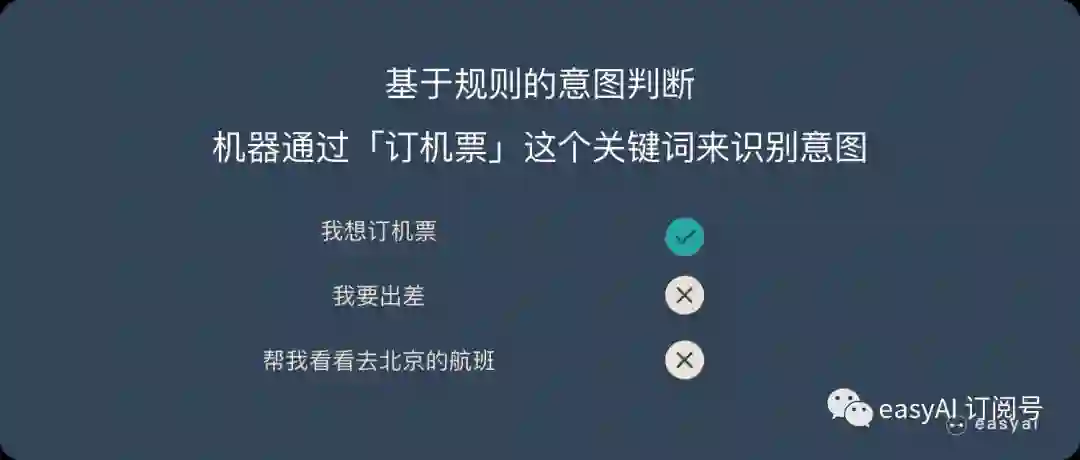 所以,无论你说“我要出差”还是“帮我看看去北京的航班”,只要这些字里面没有包含提前设定好的关键词“订机票”,系统都无法处理。而且,只要出现了关键词,比如“我要退订机票”里也有这三个字,也会被处理成用户想要订机票。