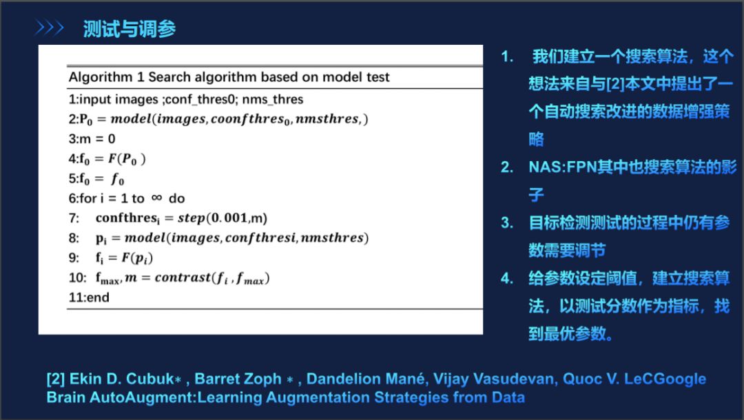 陶思辉表示最后的突破在调参的部分,在这次比赛中陶思辉建立了一个搜索算法,来自一篇自动增强的论文里面的想法,这个算法主要给置信度一个上下限,让模型以测试的结果为标准,不断去找到一个局部最优值。点击下方视频即可观看完整报告: