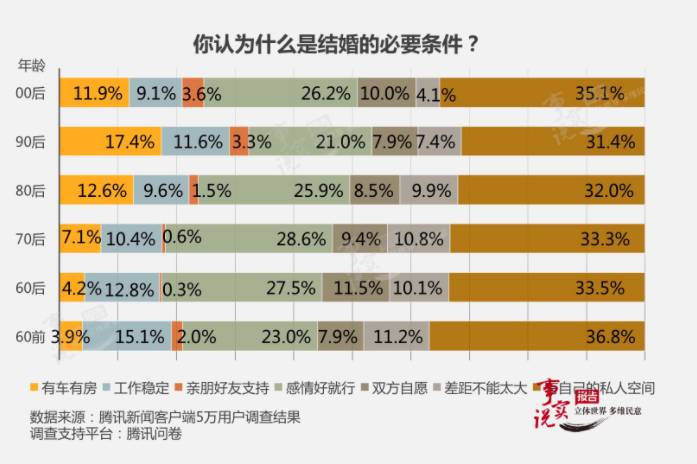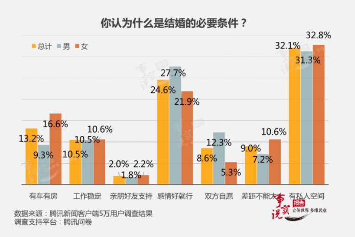 那么在年轻人眼里,结婚的必要条件又是什么呢?根据腾讯的《2016年中国婚恋调查报告》,“婚后有私人空间”和“双方感情好”都是非常重要的结婚条件,接下来是“有房有车”和“工作稳定”。
