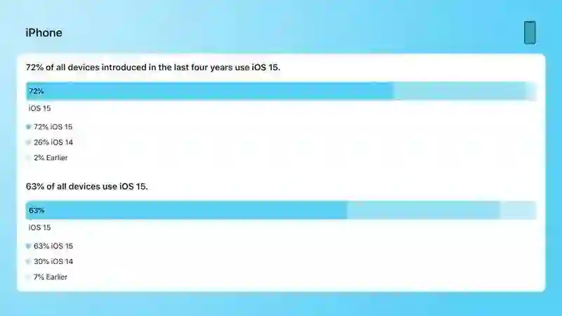 在过去四年推出的所有iPhone中,有72%安装了iOS 15。26%的设备继续使用iOS 14,2%的设备运行较早版本的iOS。如果算上四年多前发布的iPhone,63%的人运行的是iOS 15,30%的人运行的是iOS 14,7%的人运行的是更早版本的iOS。