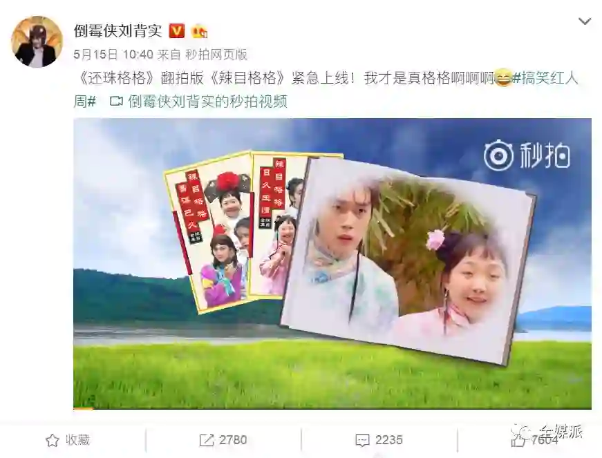 除了对原剧再加工,有才网友们还自制搞笑短视频来“致敬”经典。微博博主@倒霉侠刘背实就曾带来《还珠格格》翻拍版《辣目格格》,雷人的剧情,反串的表演都完美地展现了“辣目”的特质,而同班底翻拍剧《依苹的前半生》早在去年就让XXXL号的依萍火了一把。