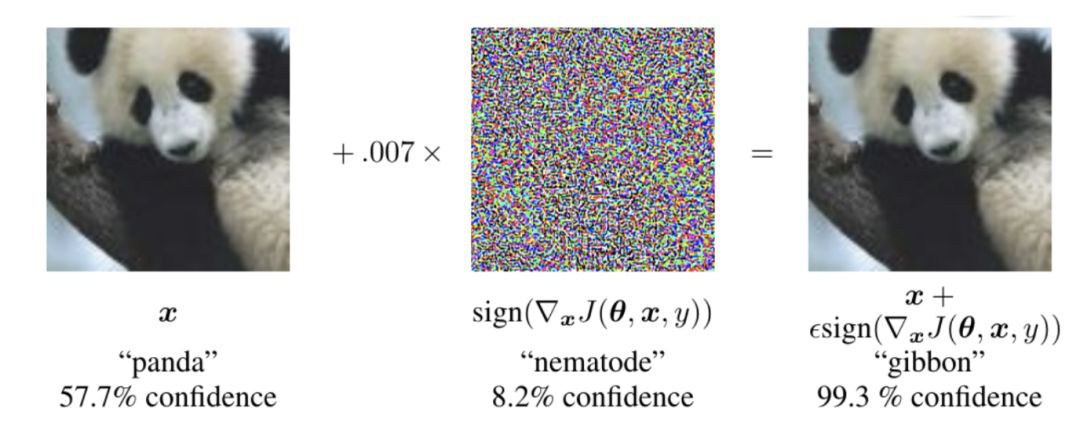 例如,如果你有一个图像分类模型,并且它能以相当高的置信度(57.7%)正确地对这张图片作出熊猫的分类,但事实上可以这张图片中每个像素变化一点点得到一张新的图片,这样它虽然看起来仍是熊猫,但却会被图像分类模型以极高的置信度(99.3%)错误地识别为长臂猿。