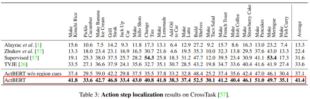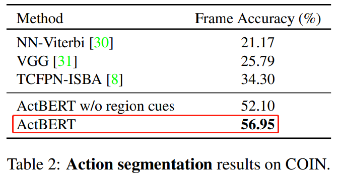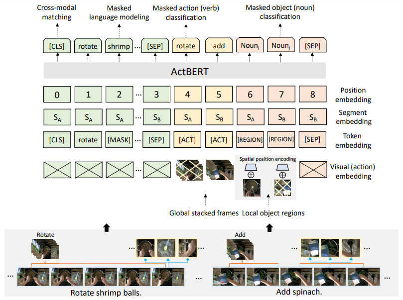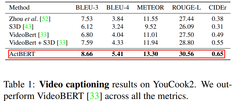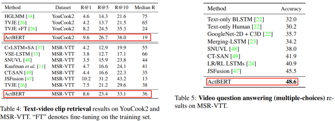 最后,提出四个训练任务来学习 ActBERT。预训练后的 ActBERT 被转移到五个与视频相关的下游任务,并定量地显示 ActBERT 达到了最先进的性能。