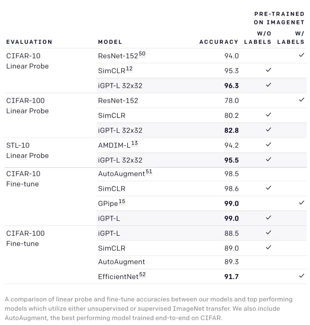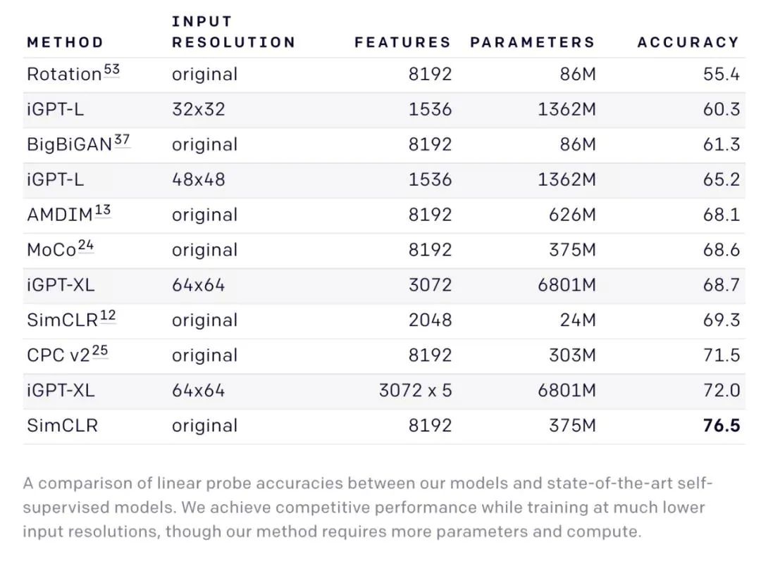 iGPT 和当前最优自监督模型的 linear probe 准确率对比情况。