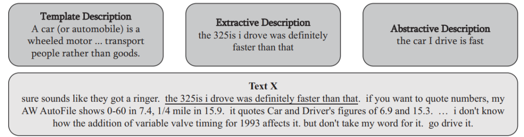 通过不同策略建构的描述类型。文本来自 20news 数据集。