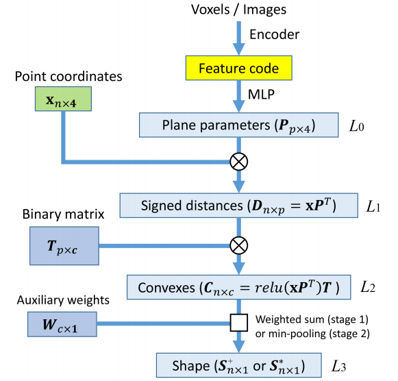 利用这一属性,研究者设计了 BSP-Net,该网络可以通过凸分解来学习表示 3D 形状。重要的是,BSPNet 以无监督方式学得,因为训练过程中不需要凸形分解。该网络的训练目的是,为使用基于一组平面构建的 BSPtree 获得的一组凸面重构形状。经过 BSPNet 推断的凸面可被轻松提取以形成多边形网格,而无需进行等值曲面处理。生成的网格是紧凑的(即低多边形),非常适合表示尖锐的几何形状。此外,它们一定是水密网格,并且可以轻松参数化。