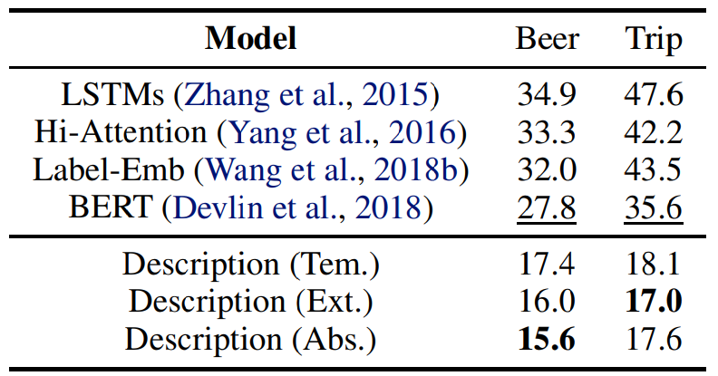 BeerAdvocate(Beer) 和 TripAdvisor(Trip) 数据集上多角度情感分类的测试误差率。