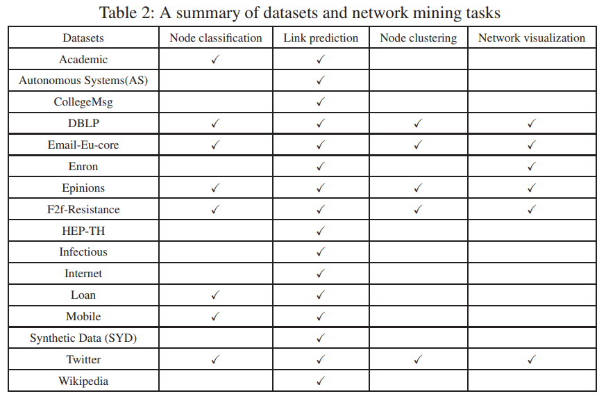 在动态网络嵌入实验中执行各种网络挖掘任务的数据集。