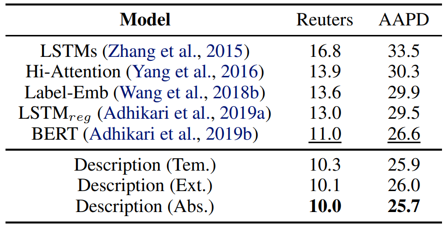 。文本描述可以通过手动模板(handcrafted template)或者使用强化学习摘要式 / 提取式模型来生成。描述和文本的级联被馈入到分类器,以决定当前标签是否应该分类给文本。