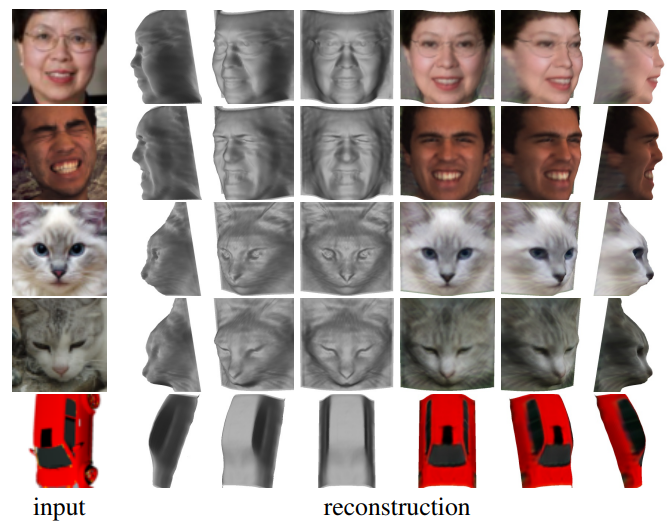 。该方法基于一个自编码器,它将每张输入图像分解为深度、反射率、视点和光照(将这四个组件结合起来即可重建输入图像)。该模型在训练过程中仅利用重建损失,未使用任何外部监督。为了在不使用监督信号的前提下将这些组件分解开,研究人员利用了很多物体类别所具备的属性——对称结构。