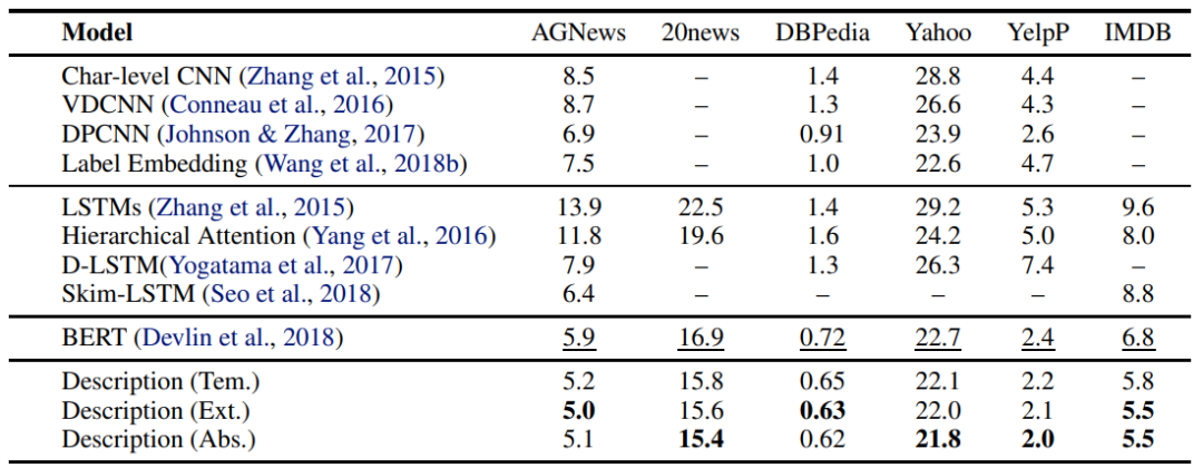 AGNews、20news、DBPedia、Yahoo、Yelp P 和 IMDB 数据集上单标签分类的测试误差率。
