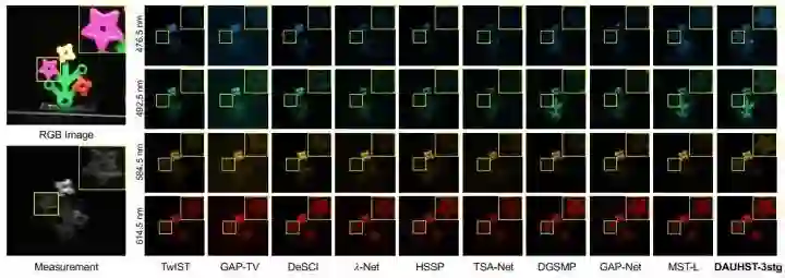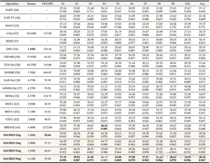 定量实验对比如表 1 所示,我们的 DAUHST 以更低的计算量和参数量显著超越了之前 16 种 state-of-the-art 方法。我们的方法比先前最好的方法 End-to-end 方法 CST-L 和 Deep Unfolding 方法 BIRNAT 要分别高出 2.24 和 0.78 dB。